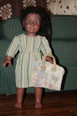 For those of you who’ve been following me for a while, you may remember the plain dress Marilla made Anne to replace her yellow-gray wincey (that was a cross between the snuffy-colored gingham and the black and white checked sateen) and the carpet bag with the funky handle (okay, I didn’t replicate that part.)