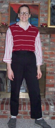 Mismatched shirt and sweater vest-my own shirt with my brother Dan’s sweater vest. Note that the vest is tucked into my pants.