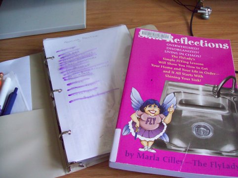 Then recently, I’ve been reading Marla Cilley’s (the FlyLady) book Sink Reflections. She talks about her “Control Journal” inside and recommends that readers make one of their own using a 8.5×11 three ring binder. She talks about putting your routines inside page protectors so that you can use a dry erase marker to mark off each step as you complete it. I like the idea, but abhor the thought of using that large of a notebook for my Control Journal. I prefer using half sheet notebooks for anything that I’m going to be carrying around with me regularly. Besides which, my planner (which I will begin using again when life demands–when I get back to being a student after my brief respite into the leisurely life of the working woman ;-P) uses a half sheet, and it’s much easier to let everything be consistent.